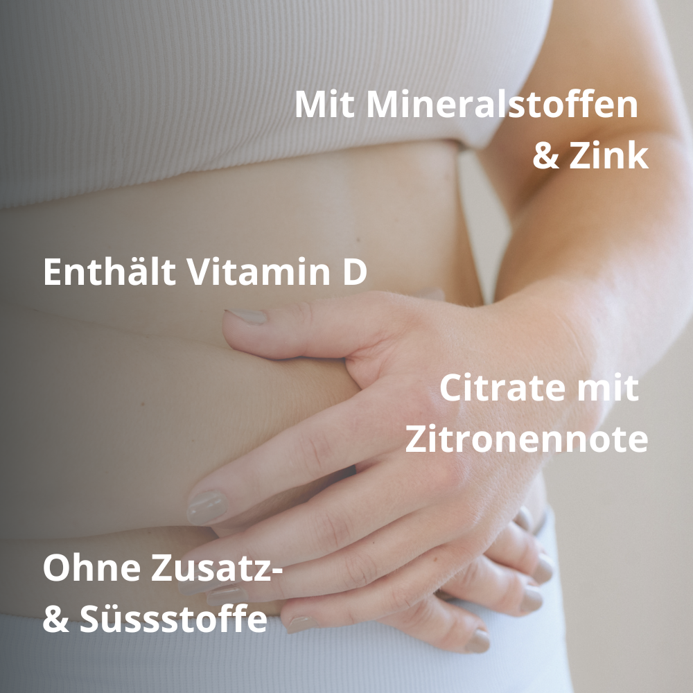 Kaliumcitrat, Calciumcitrat, Magnesiumcitrat, natürliches Zitronenaroma, Siliciumdioxid, Zinkcitrat, Cholecalciferol