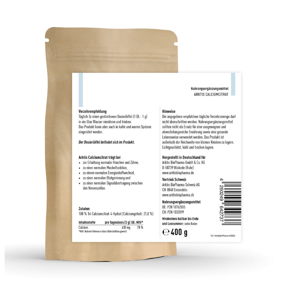 Mit Arktis Calciumcitrat steht dir eine gut bioverfügbare und reine Calciumquelle zur Verfügung. Das Pulver lässt sich einfach dosieren und vielseitig anwenden – ob im Wasser oder in Speisen. Ideal für alle, die ihren Calciumbedarf gezielt und individuell decken möchten.