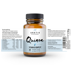 Quinoasprossenpulver (enthält Niacin, Pantothensäure, Riboflavin, Pyridoxin, Thiamin, Folsäure, Biotin, Cobalamin) Kapselhülle: Hydroxypropylmethylcellulose