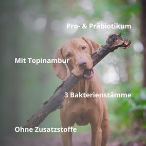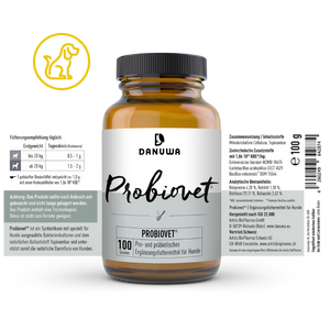 DANUWA Probiovet combines probiotic microorganisms with natural prebiotics from Jerusalem artichokes. This balanced mixture can help to maintain the natural balance of your dog's intestinal flora.
