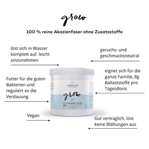 Grow est un produit à base de poudre de fibres d'acacia. Les fibres d'acacia sont la sève séchée de l'arbre d'acacia. Ces fibres se dissolvent facilement dans l'eau et peuvent ainsi être bues. Elles servent de nourriture aux bonnes bactéries intestinales et ont un effet positif sur la structure de la muqueuse intestinale.