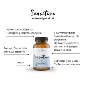 Sensitive est un mélange de bactéries positives et bénéfiques pour ta flore intestinale. Ces bactéries peuvent bloquer l'histamine et la réduire, et ont en outre une influence positive sur le milieu intestinal.