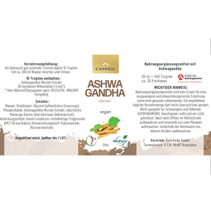 Wasser, Stabilisator: Glycerin (pflanzlichen Ursprungs), Phospholipide, Ashwagandha-Wurzel-Extrakt (KSM-66®), natürliches Maracuja-Aroma, Aloe Vera (aus Gelkonzentrat), Verdickungsmittel: Gummi arabicum, mittelkettige Triglyceride (MCT-Öl aus Kokos), Konservierungsstoff: Kaliumsorbat, Rosmarinextrakt.